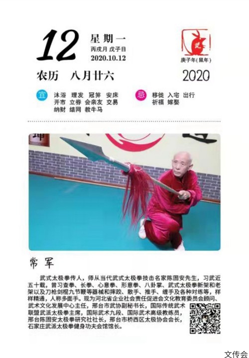由于多年来其对中国传统武术和太极拳做出了突出的贡献,践行社会主义核心价值观,弘扬武术文化正能量,荣幸入编由东方文化出版社2020年末分别出版的《中国武术家》及《太极精英榜》的2021年日历。