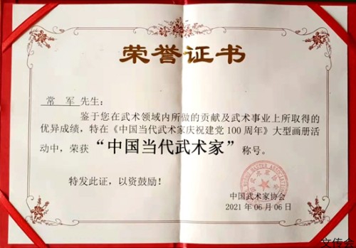 2020年参加由中国武术家协会主办的“中国当代武术家庆祝建党100周年画册”的大型活动并颁发“中国当代武术家”证书!