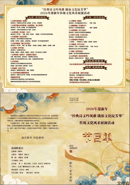 2025年下半年,与甘肃省妇女儿童服务中心联合成立了传统文化传习所,开设古琴弹唱(吴门虞山派)、诵读、古诗文传承、华夏文脉经典解读、剪纸、国画、书法、古埙演奏、香道、太极拳、太极剑、禅舞、声乐等十多种专业课程,聘请非遗大师和资深专业教师长期授课,为群众搭建学习和弘扬优秀传统文化的平台,同时还将定期举办沙龙、讲座及大型群众传统文化展演活动。1月28日成功举办了2026迎新年“经典诗文吟风雅 陇巾帼绽芳华”传统文化展演活动,汇集了古琴弹唱、古埙伴诵古诗词、敦煌舞、东乡族非遗刺绣服饰走秀、羌族非遗舞蹈、藏族非遗舞蹈、古诗词传唱等多个节目,展现了陇原传统文化的魅力和风采,受到社会各界的好评。