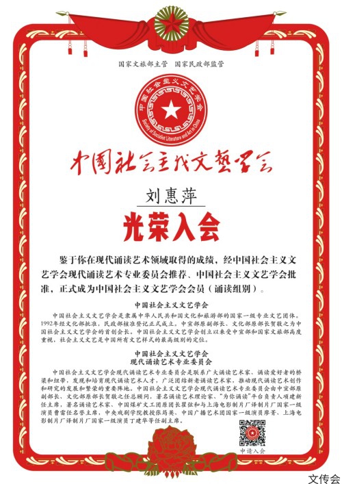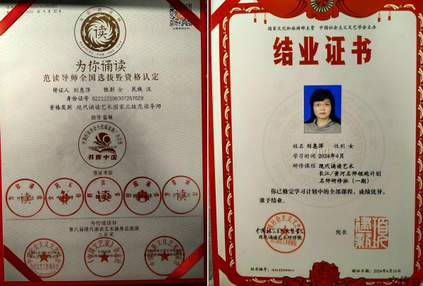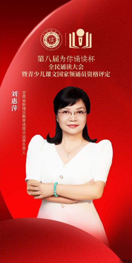刘惠萍:副教授,中国国际教育电视台《诵读中国》栏目副导演甘肃区域负责人、甘肃省文化产业职教集团秘书长、甘肃省妇女儿童服务中心传统文化传习所负责人、甘肃思博雅职业培训学校执行校长;中国社会主义文艺协会会员、现代诵读艺术国家三级范读导师、甘肃省朗诵协会会员,甘肃省职业技能高级考评员。